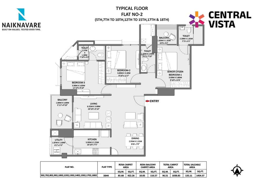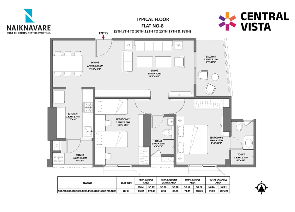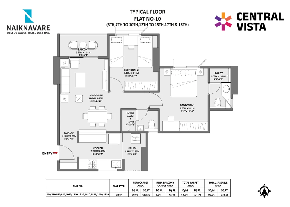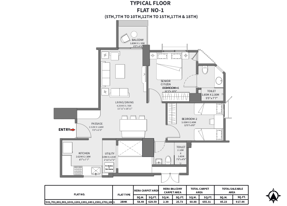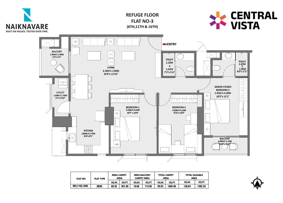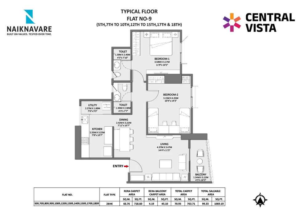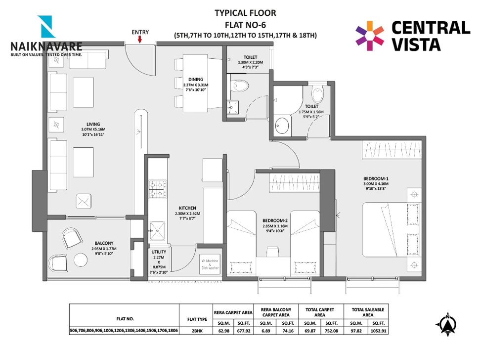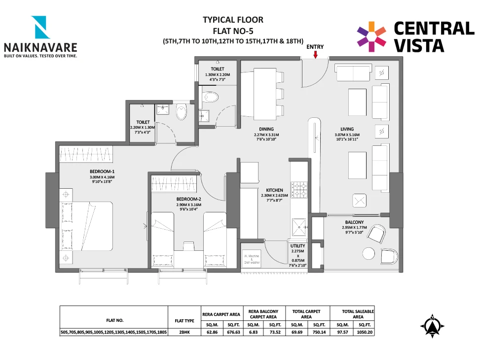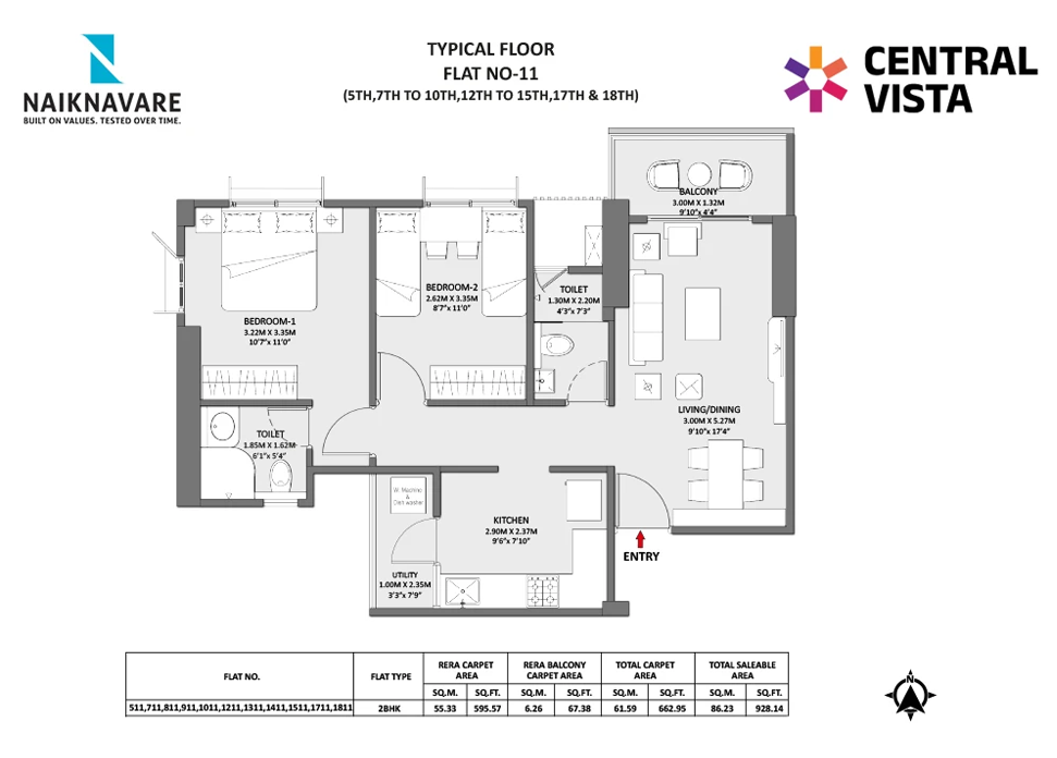 - Vitrified tiles flooring & skirting in Living room, dining, kitchen, bedrooms & passage, all balconies and kitchen utility.